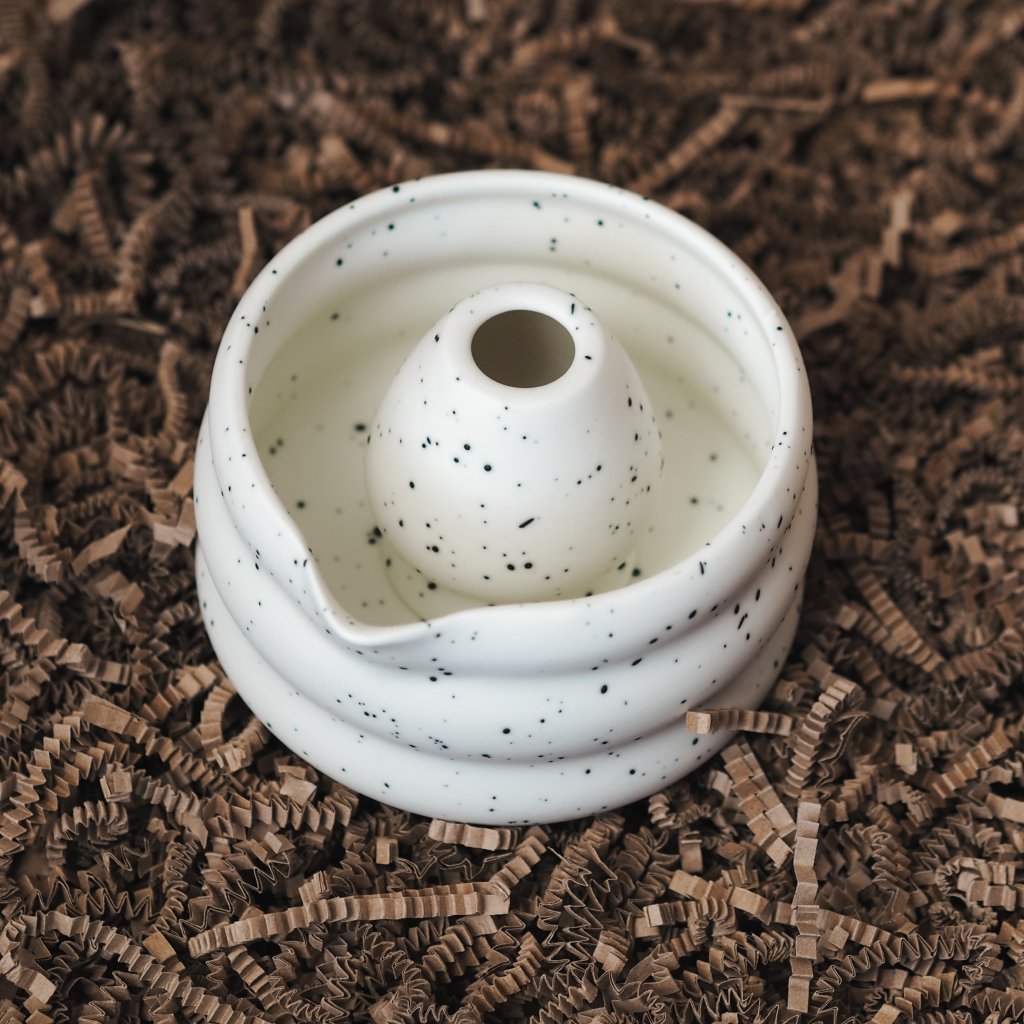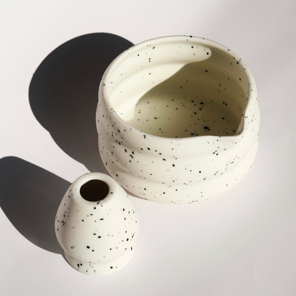 Miska má hranatější tvar s jemnými vlnkami na bocích, což usnadňuje šlehání matchy a zároveň opticky podtrhuje její design. Povrch je bílý s černými skvrnami, což vytváří moderní a hravý vzhled.