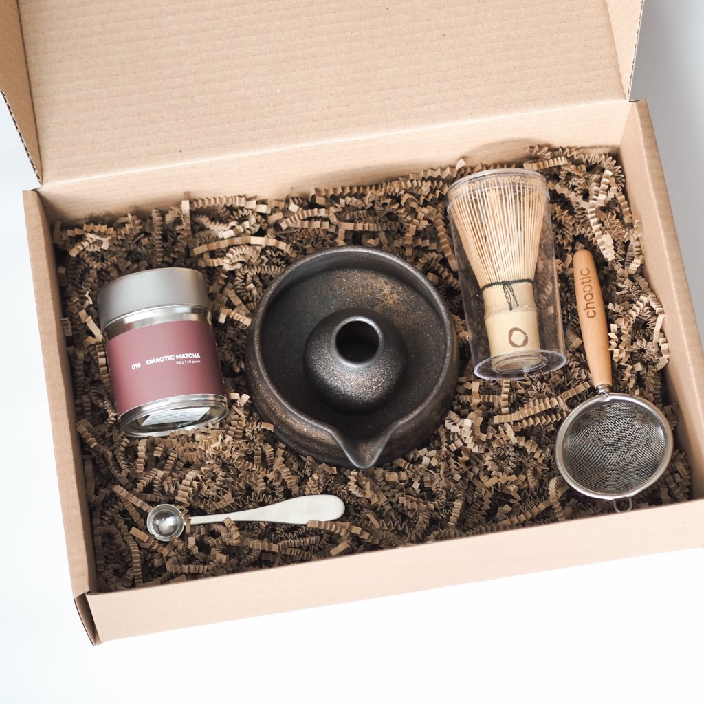 Součástí setu je prémiová matcha v různých velikostech balení, bambusová metlička pro našlehání čaje do jemné pěny, nerezová odměrka, která zjednoduší přípravu i bez nutnosti vážení, keramická miska pro samotnou přípravu, držák na metličku pro její správné usychání a jemné sítko pro prosetí matchy bez hrudek.