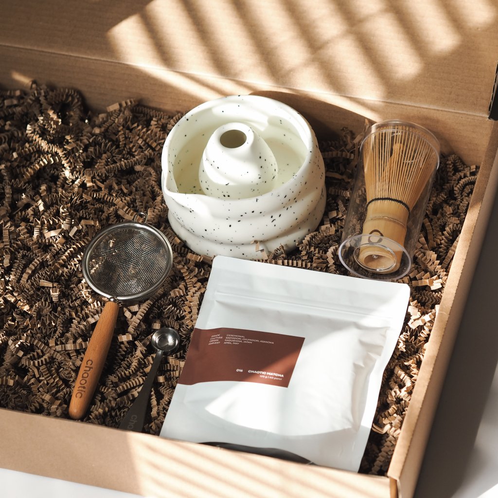 Součástí setu je prémiová matcha v různých velikostech balení, bambusová metlička pro našlehání čaje do jemné pěny, nerezová odměrka, která zjednoduší přípravu i bez nutnosti vážení, keramická miska pro samotnou přípravu, držák na metličku pro její správné usychání a jemné sítko pro prosetí matchy bez hrudek.