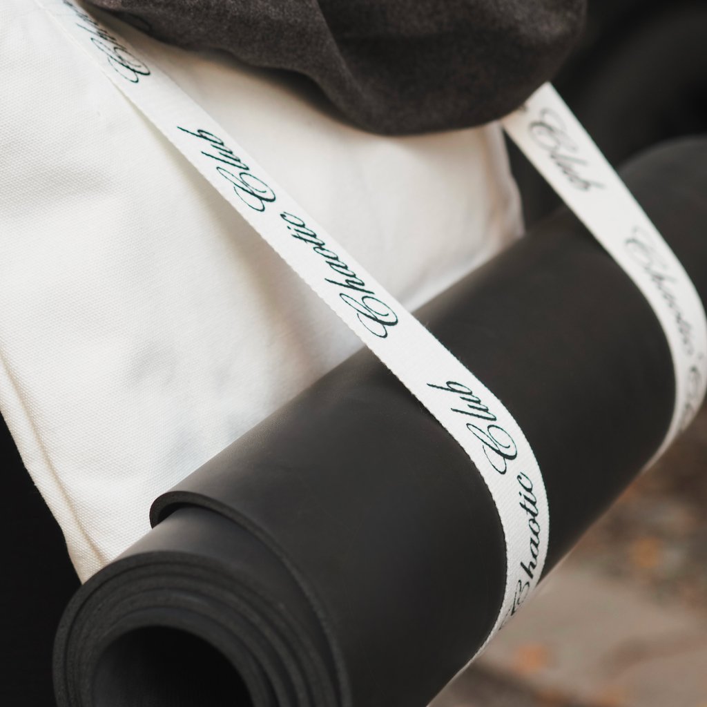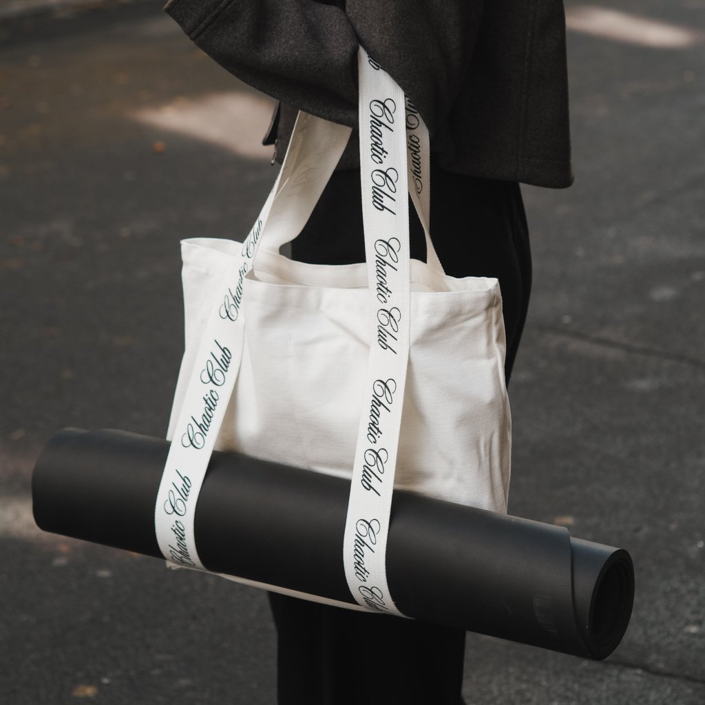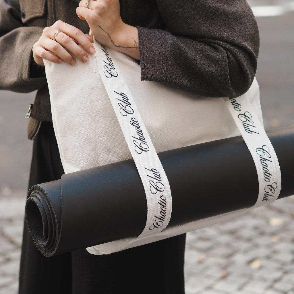 Naše plátěnka má minimalistický design – je čistě bílá s elegantním logem Chaotic Club na popruzích a díky pevnému materiálu držícímu tvar se liší od běžných plátěnek, které se při odložení sesunou. Popruhy tašky slouží zároveň jako integrovaný držák na podložku, což zajišťuje univerzální využití a pohodlné přenášení vybavení na cvičení.
